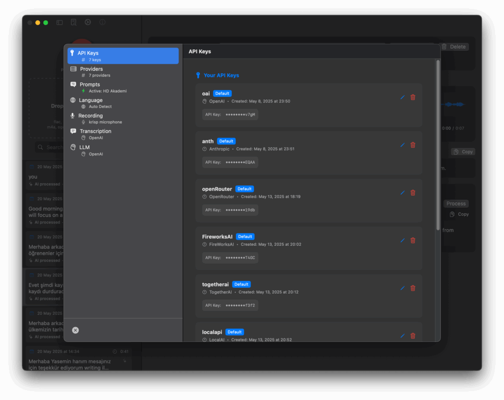 - Custom Prompts: Create and manage powerful prompts to automatically process your transcriptions. Summarize, reformat, extract insights, translate, or apply any custom instruction using your preferred LLM provider (OpenAI, Groq, Anthropic, or custom).